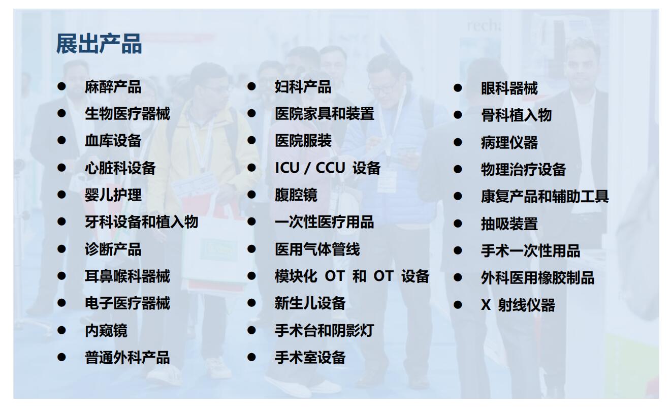 麻醉产品、生物医学仪器、血库设备、心脏病设备、婴儿和婴儿护理、牙科设备和植入材料、诊断产品、E.N.T 仪器、电子医疗仪器、内窥镜、常规外科产品、妇科产品、医院家具及固定装置、医院服装、ICU / CCU 设备、腹腔镜、医疗一次性用品、医用燃气管道、模块化 OT 和 OT 设备、新生儿器械、手术台和阴影灯、手术室设备、眼科仪器、骨科植入物、病理仪器、理疗设备、康复产品和辅助工具、抽吸设备、一次性手术用品、外科医用橡胶制品、X 射线仪器、认证机构等。
