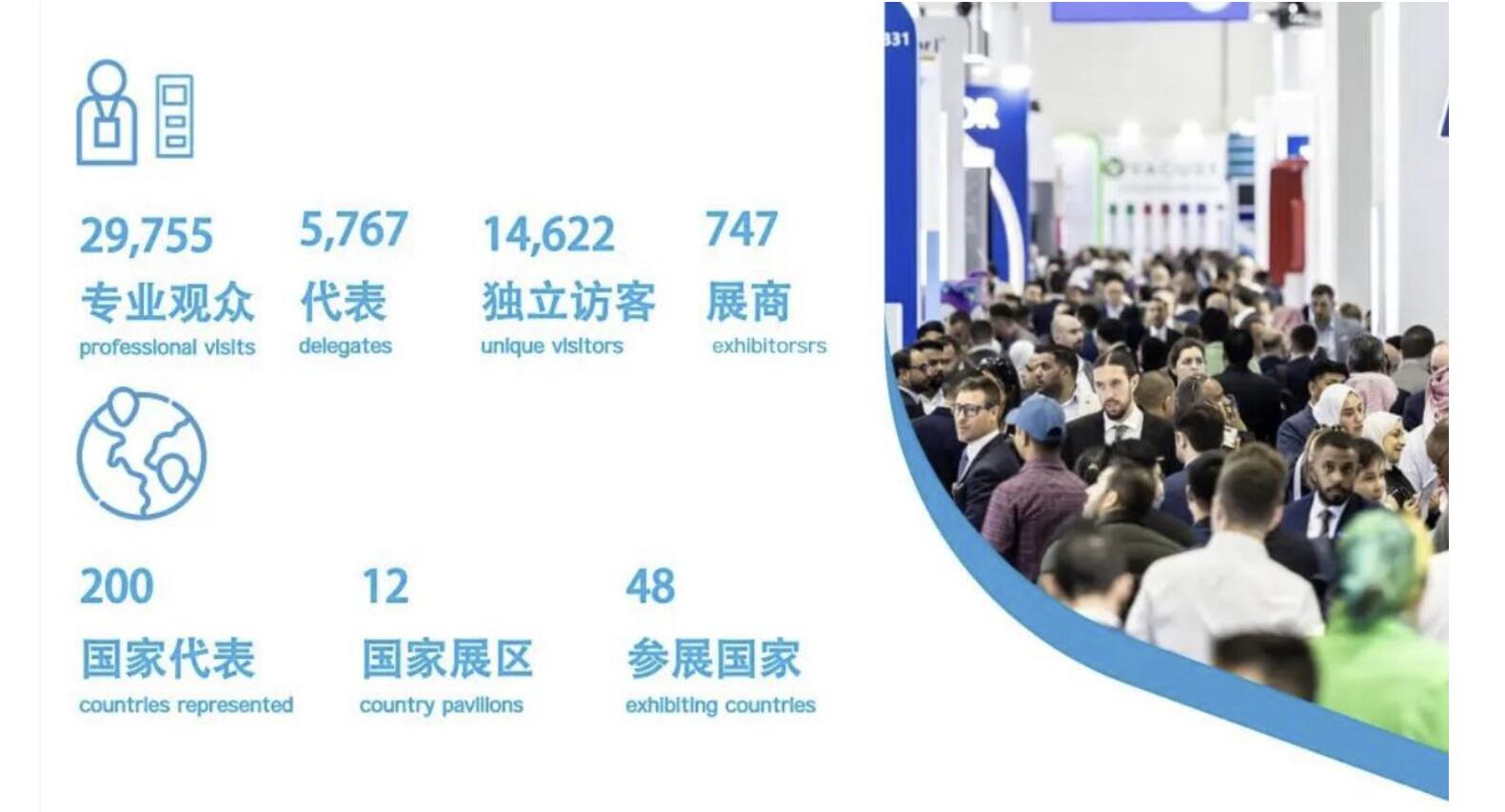 2025 年 02 月 03-06 日展会在阿联酋迪拜国际会展中心举办,展会展览面积达到 30,000 平方米,来自全球48个国家的747家展商汇聚于此展示最新的产品和技术,其中包括了201家中国展商,展会吸引近30000名专业观众来访。从与会展商和观众对展会的满意度来看,中东医疗市场可谓商机无限!