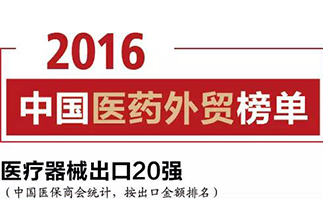 2017/03/152016中国医疗器械类商品出口企业TOP榜单近十年来,我国医疗器械产品凭借“质优价可”优势取得了持续增长的业绩。但是,在2016年全球经济复苏乏力、各国市场需求疲软、国内产业结构调整转型等因素影响下,2016年我国医疗器械对外贸易规模为389.1亿美元,同比增长仅为1.1%,同期增幅下降6.4个百分点。 -