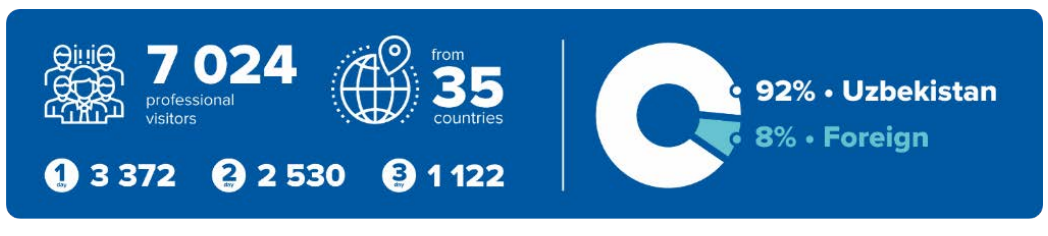 2023年共有超过250家公司参与了TIHE,其中45%是乌兹别克斯坦本土企业,还有55%是来自孟加拉国、白俄罗斯、中国、捷克、丹麦、德国、印度、意大利、哈萨克斯坦、韩国、俄罗斯、土耳其、乌克兰等的国际展商。展会现场共迎来35个国家的7024位国际观众。