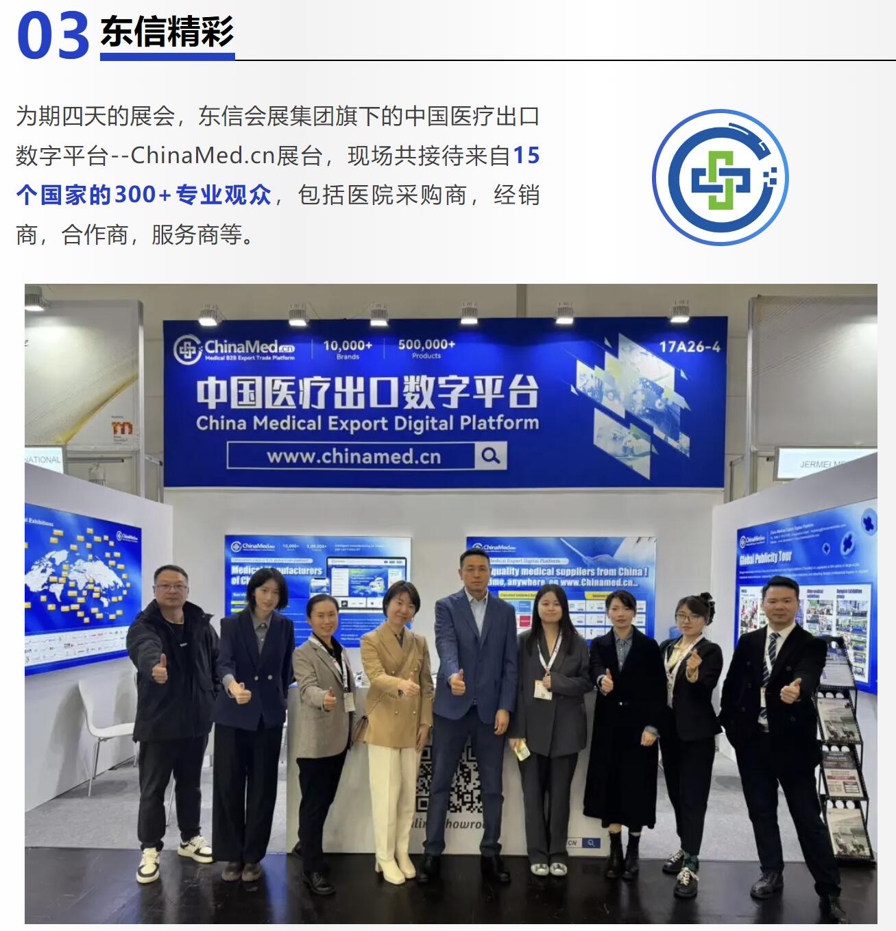 东信国际会展坚持专业化、国际化,突出服务优势,聚焦医疗器械、康复、实验室、生物技术及口腔等核心行业展会,包括德国MEDICA、迪拜Arab Health、巴西Hospitalar等。携手全球各大展览主办方,每年组织约5000家中国医疗企业及专业医疗机构参加全球70多个海外医疗展览及会议,提供参展、代参展、观展、商务行程、签证、政府补贴协助等专业、精致、贴心的服务助力企业开拓全球市场。